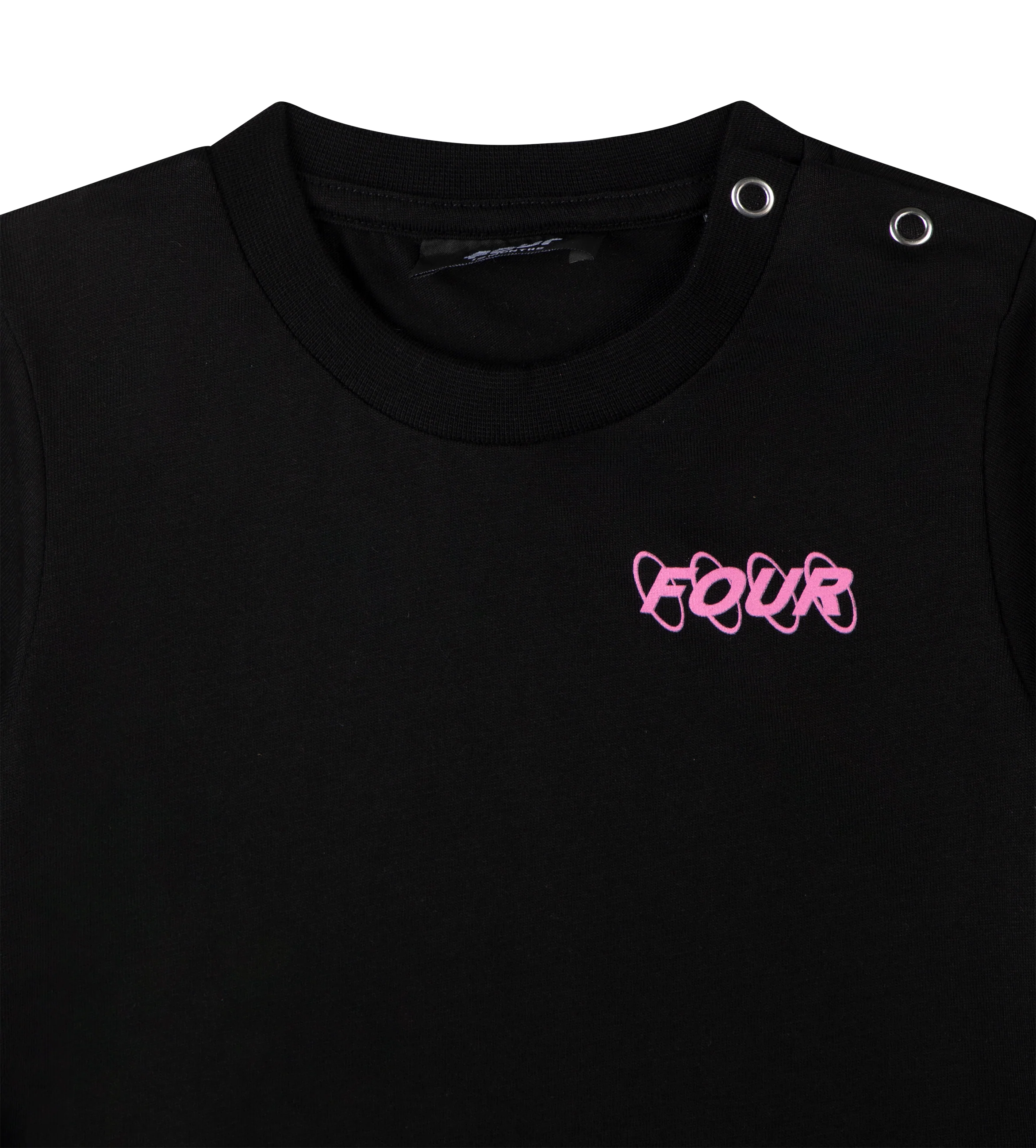 Designed for softness, comfort and a bold graphic look, the FOUR Baby Pink Circles Logo T-shirt in black is crafted from single jersey fabric of 100 percent cotton. The round neck keeps the silhouette classic and easy to wear, while the metal push buttons at the shoulder ensure effortless dressing for little ones.