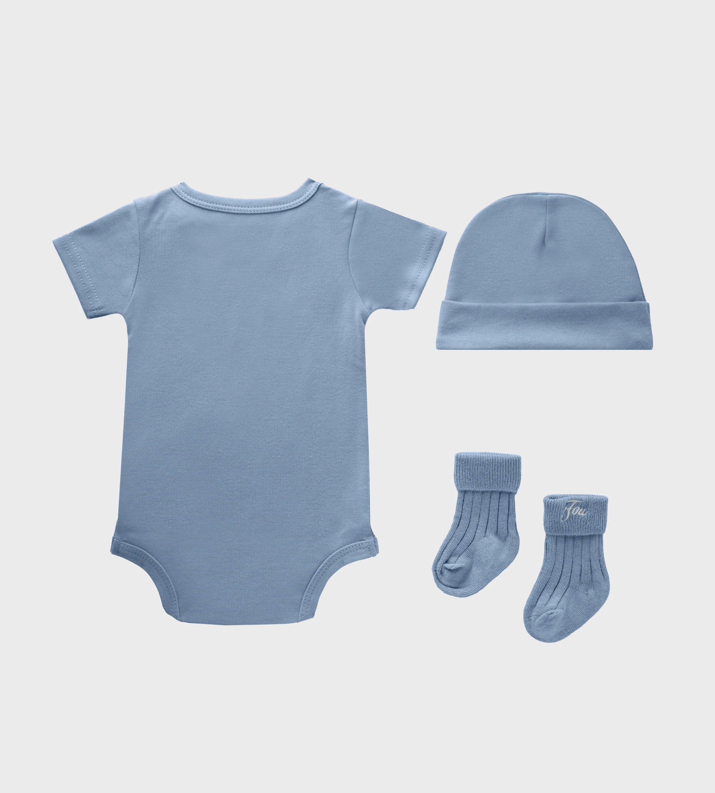 Designed as a soft, practical and ready-to-gift newborn essential, the FOUR Baby Essentials Set in blue comes packaged in a FOUR giftbox and includes a matching romper, beanie and socks.