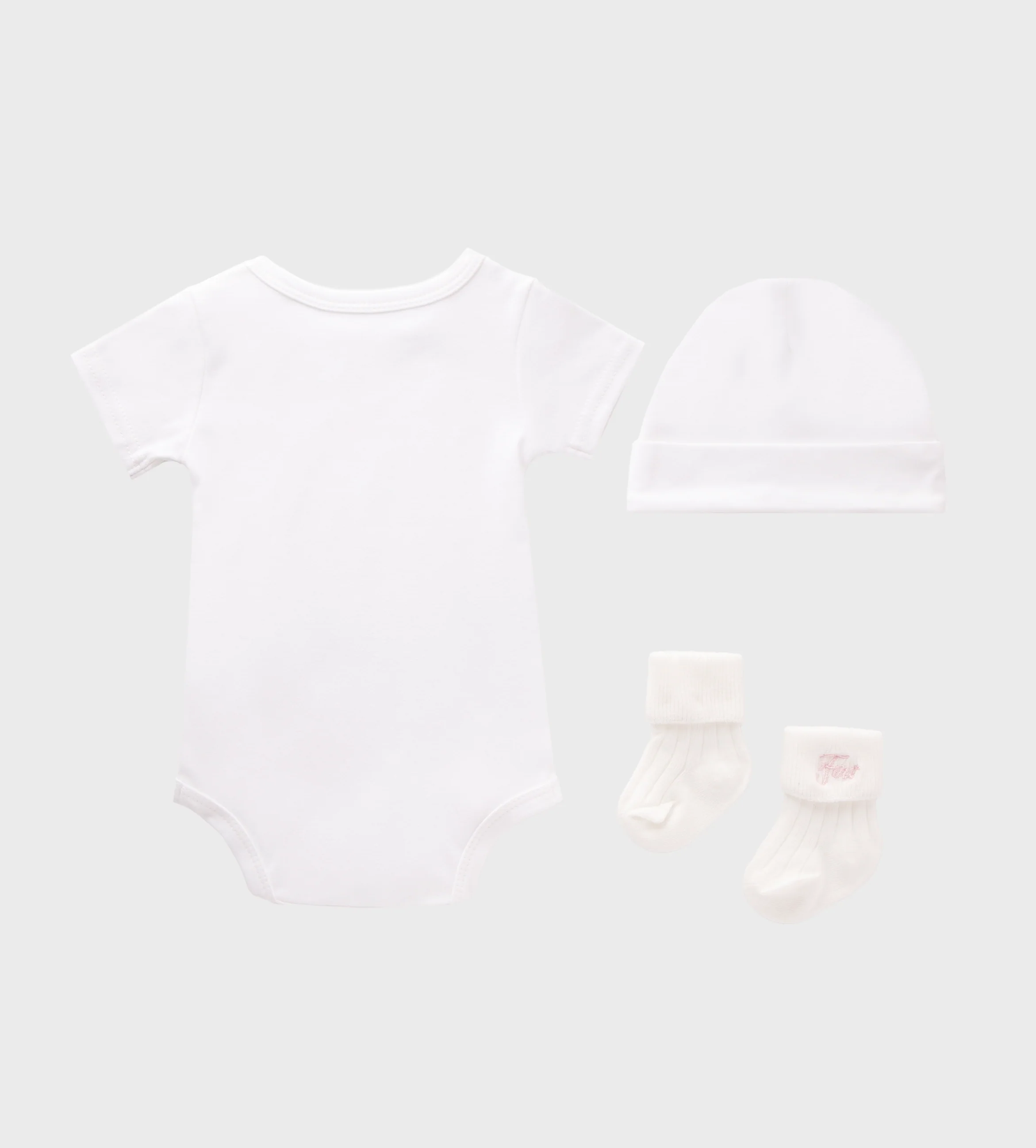 Designed as a soft, practical and ready-to-gift newborn essential, the FOUR Baby Essentials Set in white comes wrapped in a FOUR giftbox and includes a matching romper, beanie and socks.