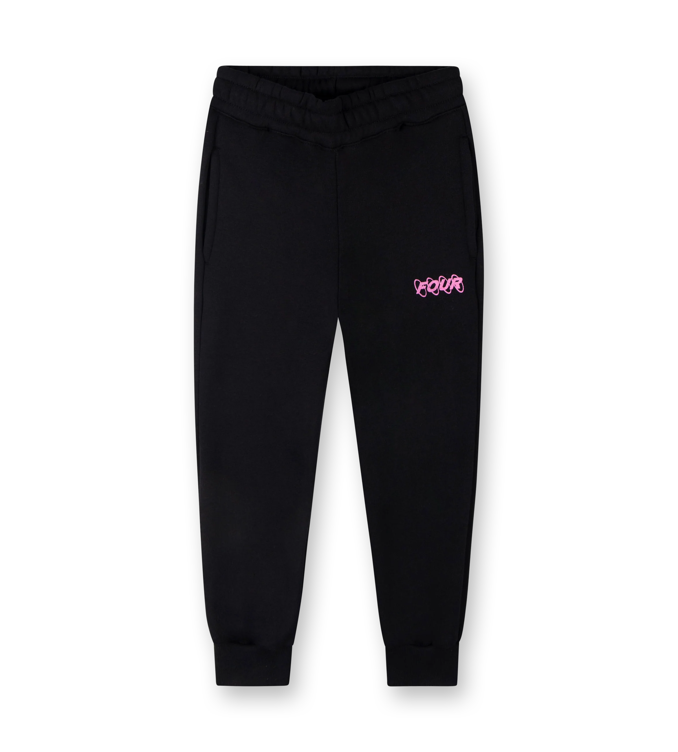 Designed for everyday comfort with a bold pop of colour, the FOUR Pink Circles Logo Sweatpants in black are crafted from soft cotton fleece made of 100 percent cotton. The front logo screenprint in pink adds a striking contrast to the deep black base, bringing a standout FOUR identity to the silhouette.