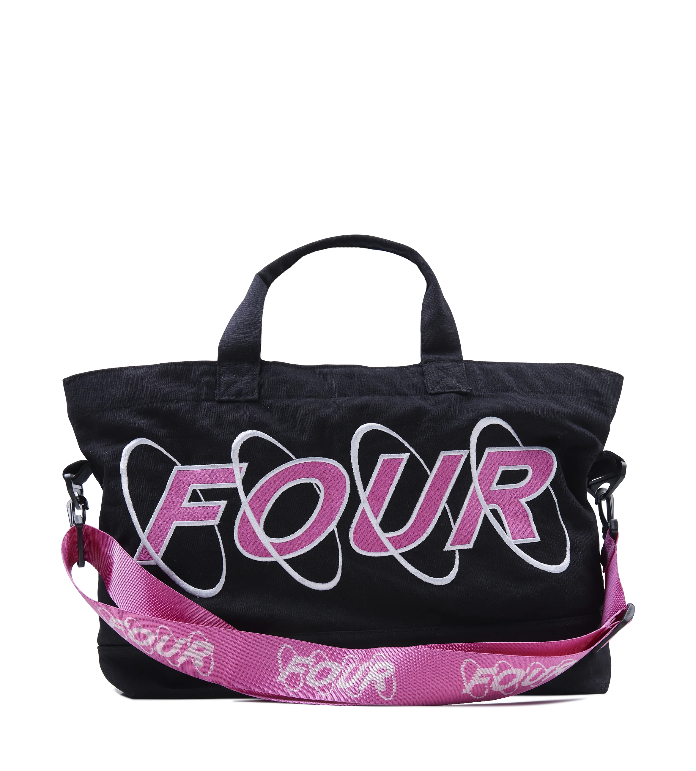 Crafted for everyday versatility, the FOUR Embroidery Shopper blends bold graphics with functional design. Made from durable black canvas and finished with pink and white embroidered circle detailing, this tote brings a modern streetwear aesthetic to a practical silhouette. The detachable pink strap with repeated FOUR branding adds a custom touch, giving you the option to wear it crossbody or hand-held.
