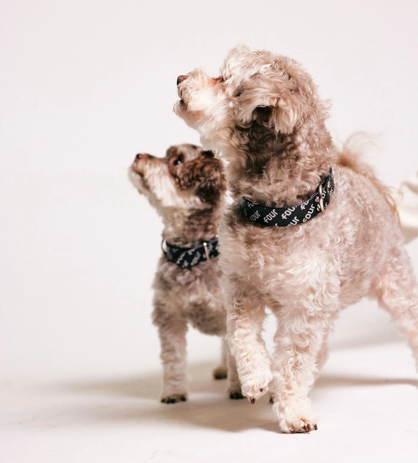 A durable PU collar featuring silver metal hardware and an all-over FOUR logo print. Adjustable with six holes for a secure and comfortable fit. Available in three sizes.