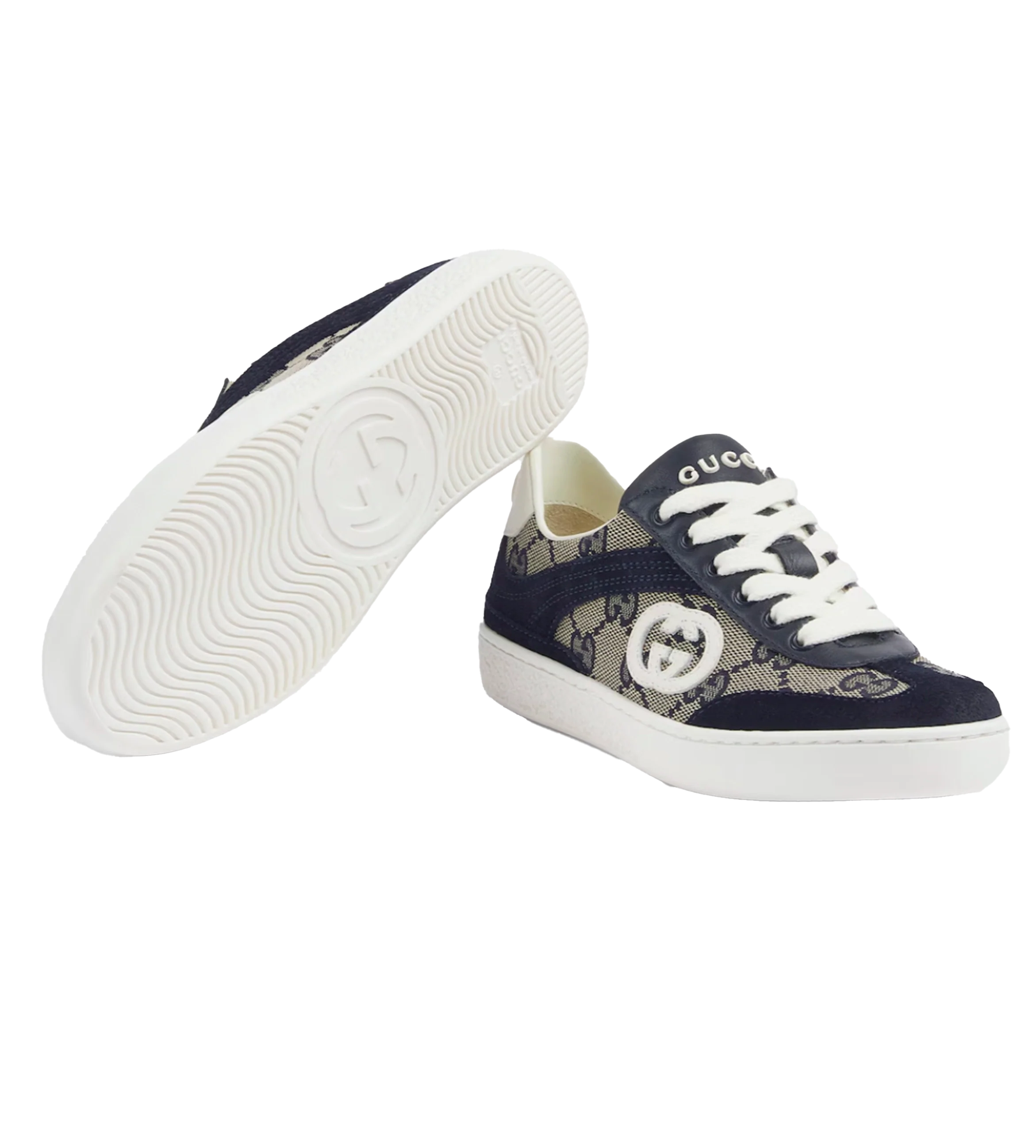Retro design, reimagined for today. These G74 sneakers from Gucci’s Pre-Fall 2025 collection blend beige and blue GG canvas with soft suede trim, inspired by classic archival styles. The Interlocking G and Gucci logos add bold branding, while canvas inserts and a round toe keep the silhouette sporty and timeless.