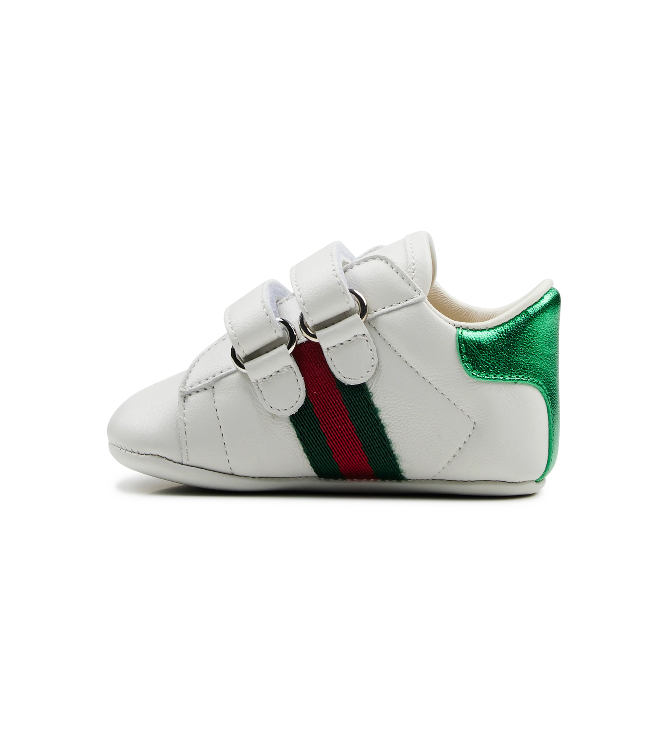 A House icon, reimagined for little feet. This baby-sized version of the Ace sneaker features smooth white leather, the classic green and red Web stripe, and signature metallic heel tabs - red on one shoe, green on the other.