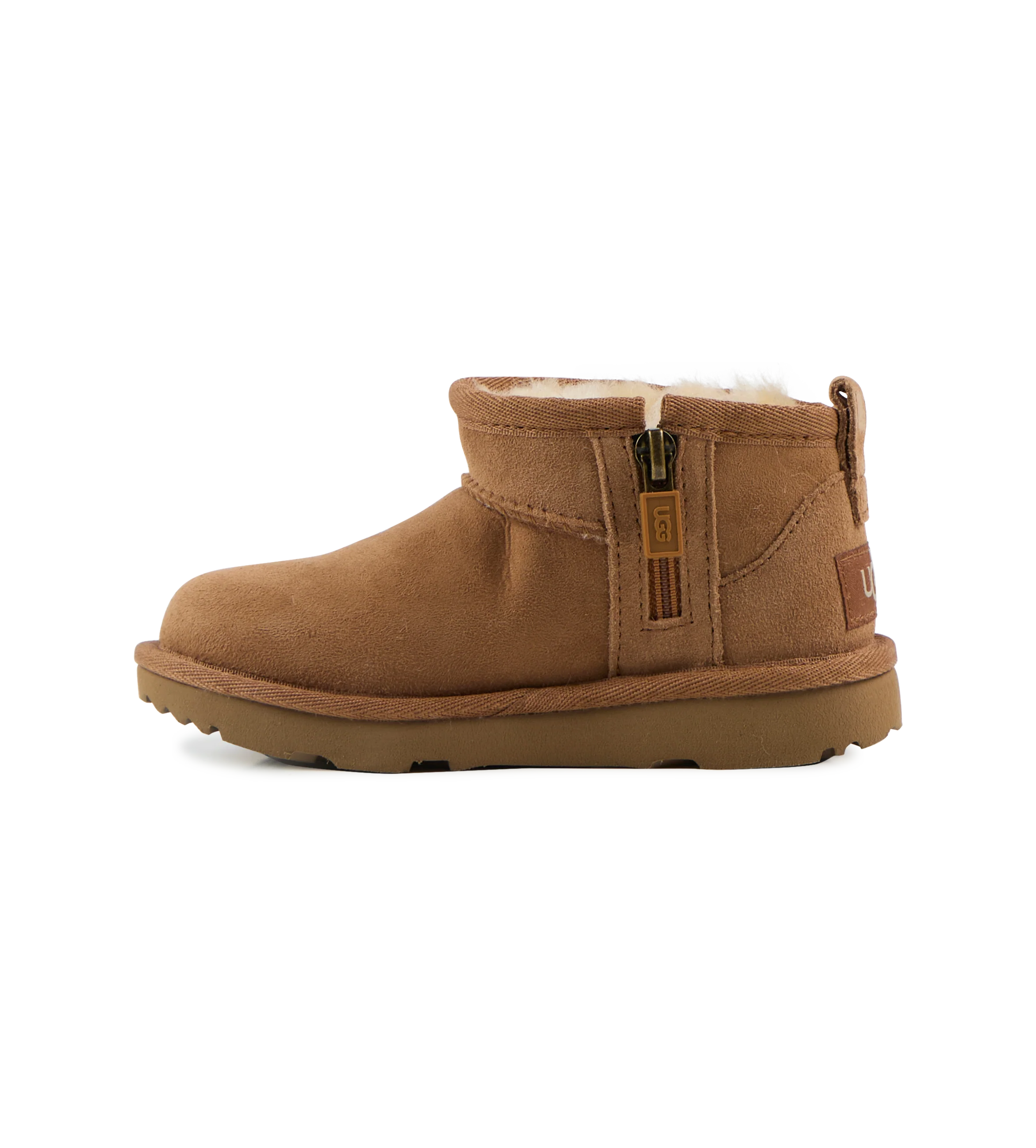 The iconic UGG boot, now in a mini version with maximum style. The Classic Ultra Mini features a lower shaft for easy on and off and endless versatility. Pre-treated to help it stay looking fresh, it has everything kids love about the original: a soft sheepskin lining, a plush UGGplush™ insole, and a flexible, lightweight sugarcane EVA sole for all-day play.
